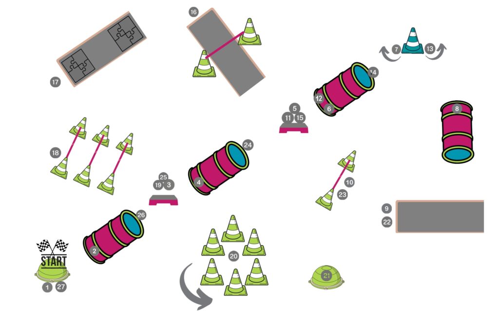 Der Parcours sollte maximal 30 Stationen beinhalten, die mehrfach angelaufen und kombiniert werden können. Ein Lauf dauert 1-2 Minuten und wird nach kurzen Zwischenpausen mehrfach wiederholt.
